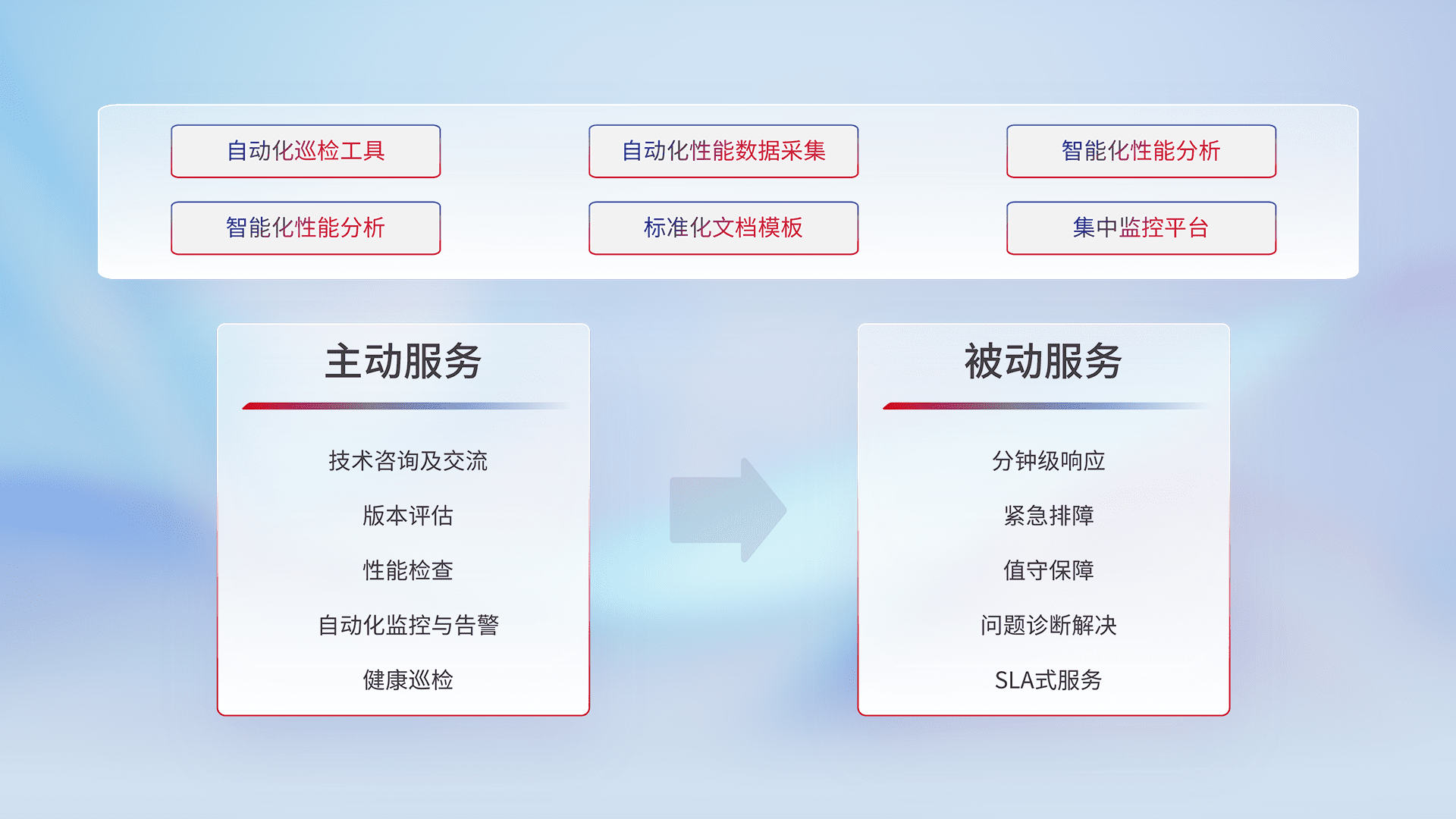 智能化工具和标准化文档,,,,保障服务质量,,,提供主动服务(包含技术咨询、、、、版本评估、、、、性能检查、、自动化监控与告警、、、健康巡检)和被动服务包含(分钟级响应、、、紧急排障、、值守保障、、问题诊断解决、、、、SLA服务)。。。